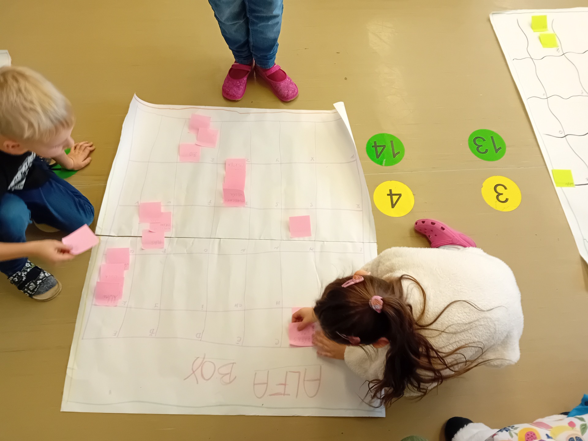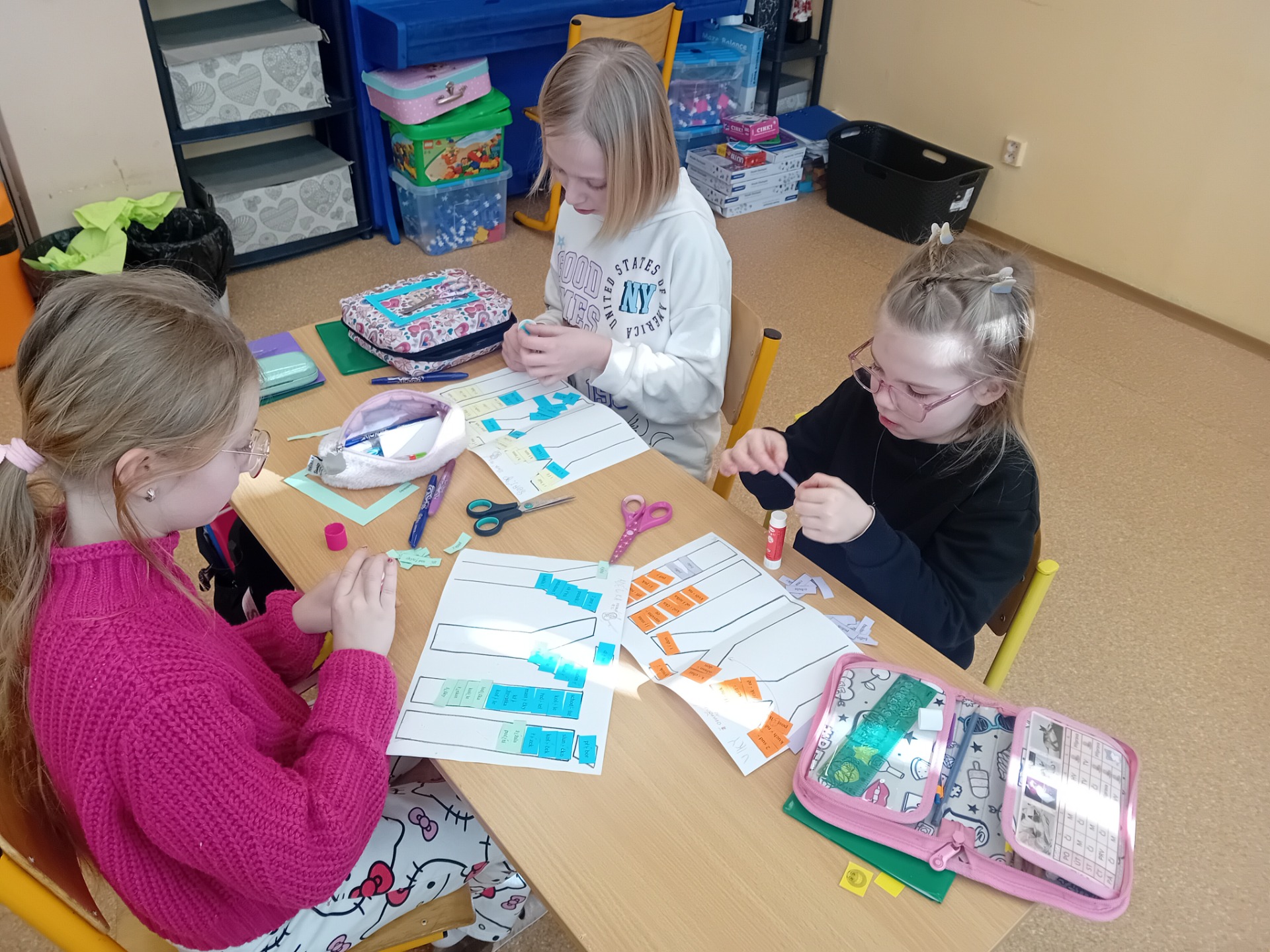 V českém jazyce jsme si prohlubovali znalosti měkkých a tvrdých souhlásek, zejména rozlišování slabik di, ti, ni a dy, ty, ny. Pomáhali jsme si dřevěnou kostkou pro tvrdé souhlásky a měkkou houbičkovou kostkou pro souhlásky měkké. Slabiky jsme třídili, doplňovali i vyhledávali v textech.